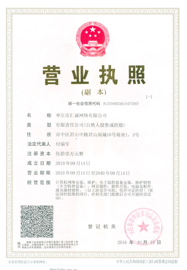 特提供三證合一后的新營(yíng)業(yè)執(zhí)照副本如下 棗莊市匯誠網(wǎng)絡(luò)有限公司營(yíng)業(yè)執(zhí)照(統(tǒng)一社會(huì)信用代碼:9137040256144770XY)